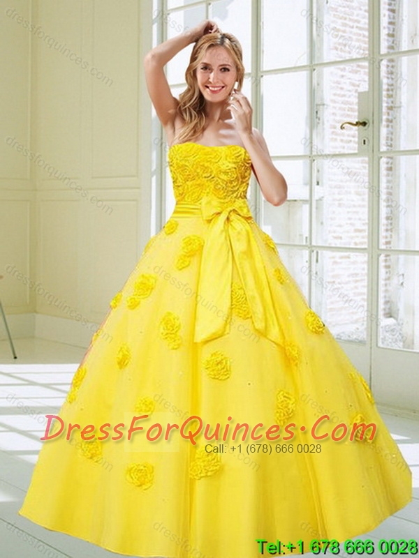 2015 Dynamic Yellow Quinceanera Dresses with Rolling Flowers and Bowknot