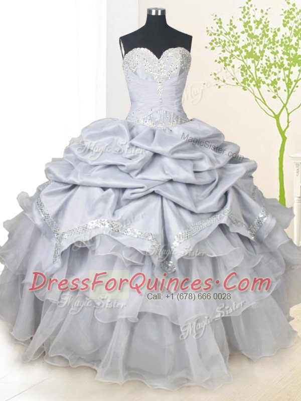 Adorable Grey Ball Gowns Beading and Sequins and Pick Ups Quince Ball Gowns Lace Up Organza and Taffeta Sleeveless Floor Length
