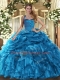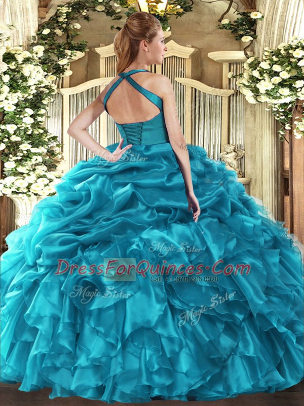 Amazing Baby Blue Ball Gowns Organza Halter Top Sleeveless Ruffles and Pick Ups Floor Length Lace Up 15th Birthday Dress