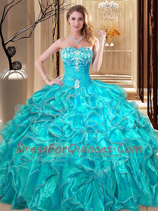 Aqua Blue Sleeveless Floor Length Embroidery and Ruffles Lace Up 15th Birthday Dress