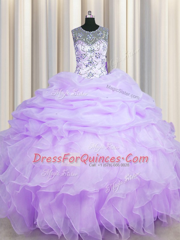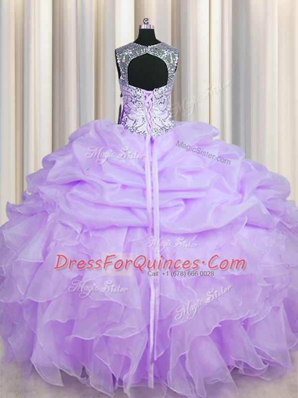 Beautiful Scoop See Through Lavender Sleeveless Organza Lace Up Quince Ball Gowns for Military Ball and Sweet 16 and Quinceanera