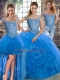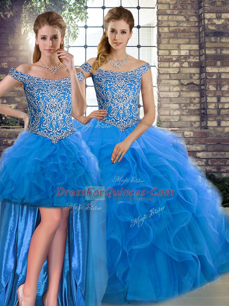 Best Selling Blue Tulle Lace Up Sweet 16 Dresses Sleeveless Brush Train Beading and Ruffles