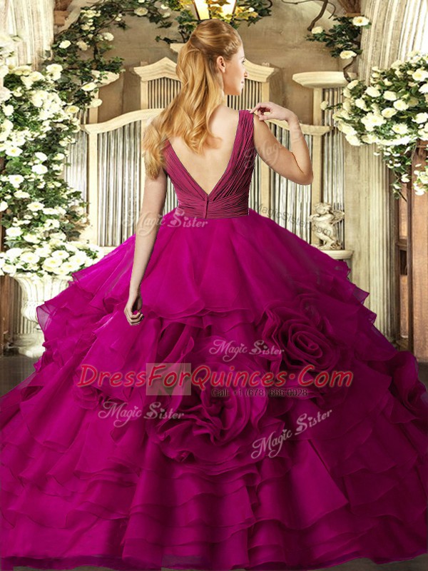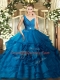 Blue Organza Backless Quinceanera Gowns Sleeveless Floor Length Beading and Ruffles