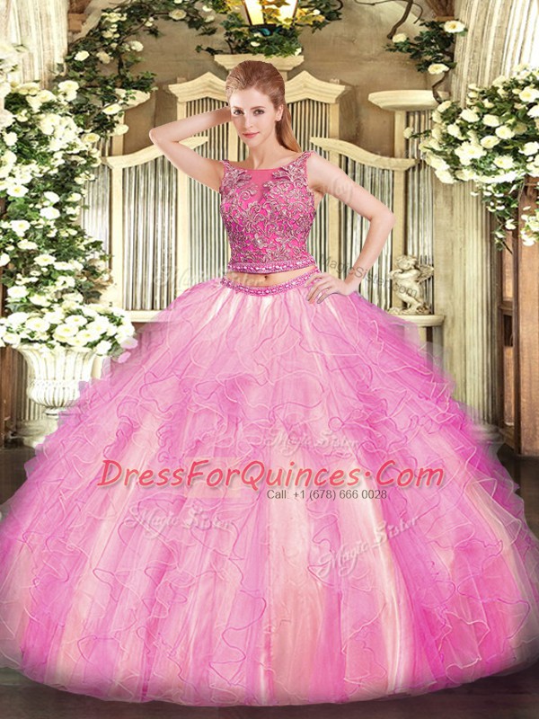 Classical Sleeveless Floor Length Beading and Ruffles Lace Up Quince Ball Gowns with Rose Pink