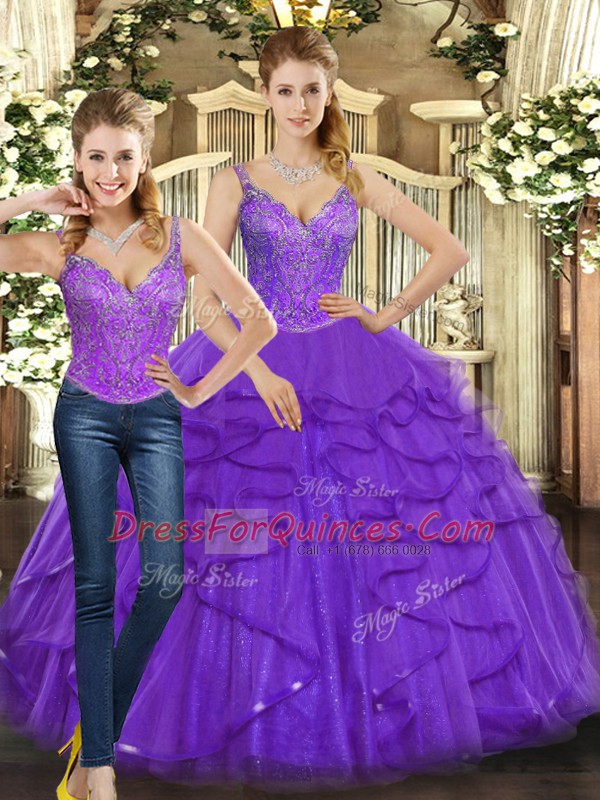 Comfortable Floor Length Lace Up Sweet 16 Quinceanera Dress Purple for Military Ball and Sweet 16 and Quinceanera with Beading and Ruffles