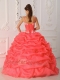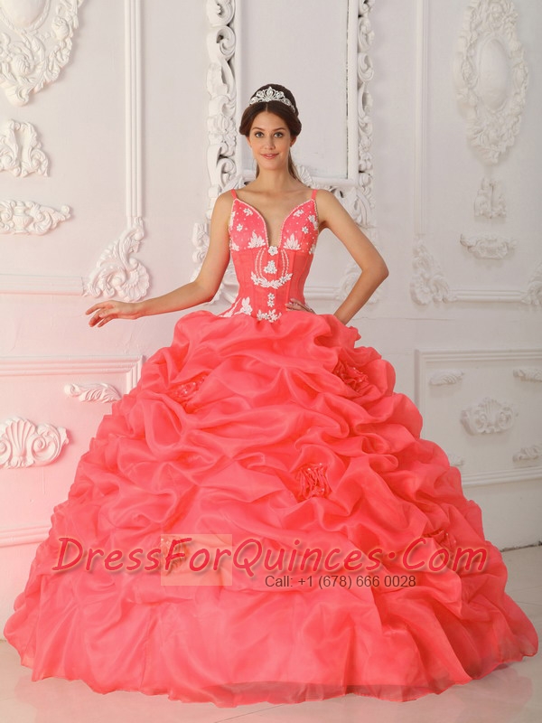 Coral Red Ball Gown Straps Satin and Organza Appliques 15th Birthday Dresses