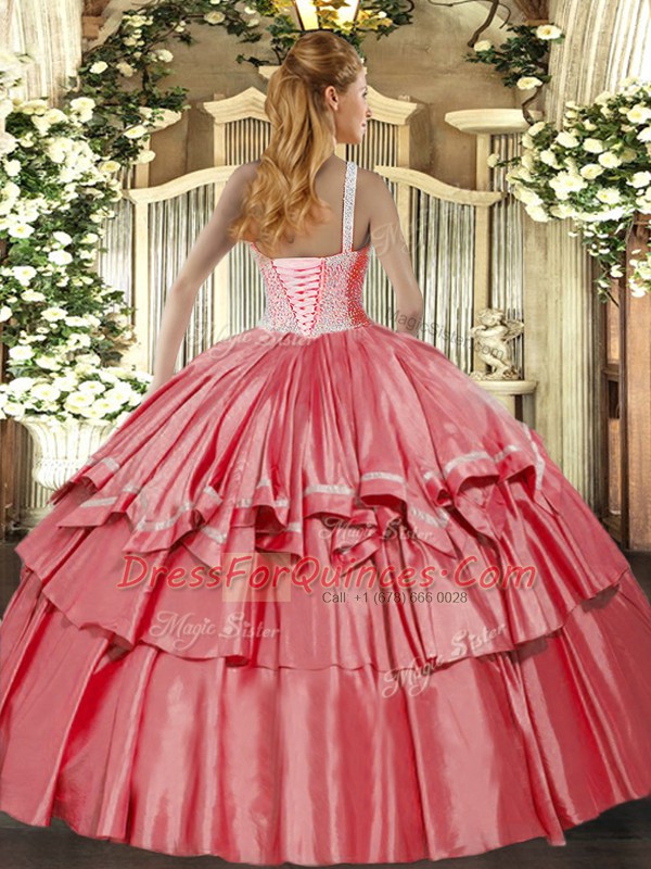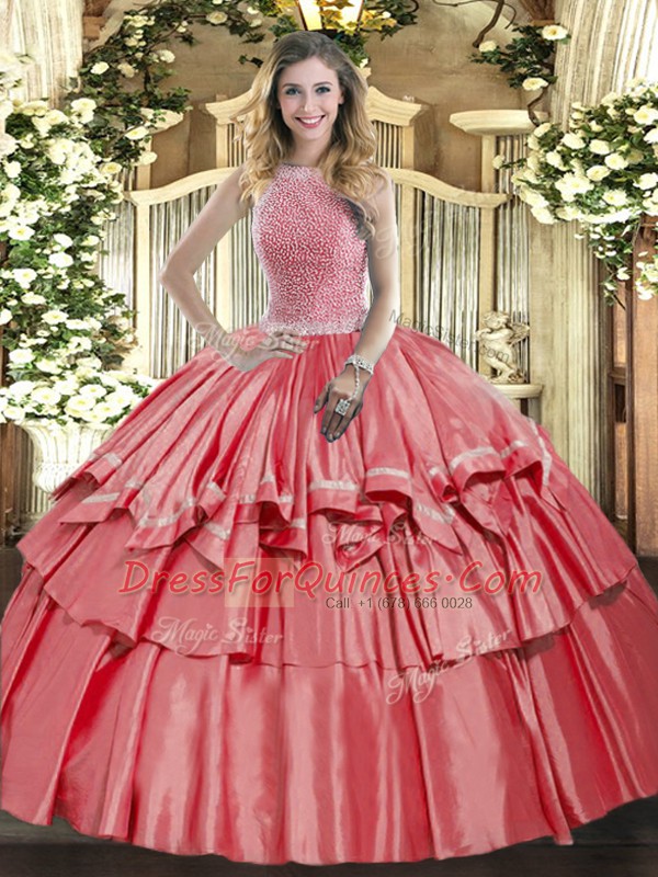 Coral Red High-neck Lace Up Beading and Ruffled Layers Quinceanera Dress Sleeveless