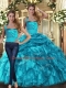 Custom Designed Halter Top Sleeveless Lace Up Sweet 16 Dress Teal Organza