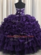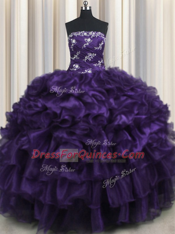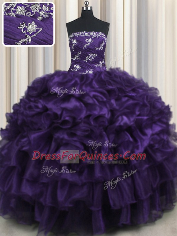 Dazzling Purple Organza Lace Up Strapless Sleeveless Floor Length Quinceanera Gowns Appliques and Ruffles and Ruffled Layers