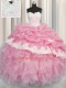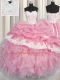 Edgy Rose Pink Organza Lace Up Sweetheart Sleeveless Floor Length Sweet 16 Dresses Beading and Appliques and Ruffles and Pick Ups