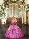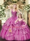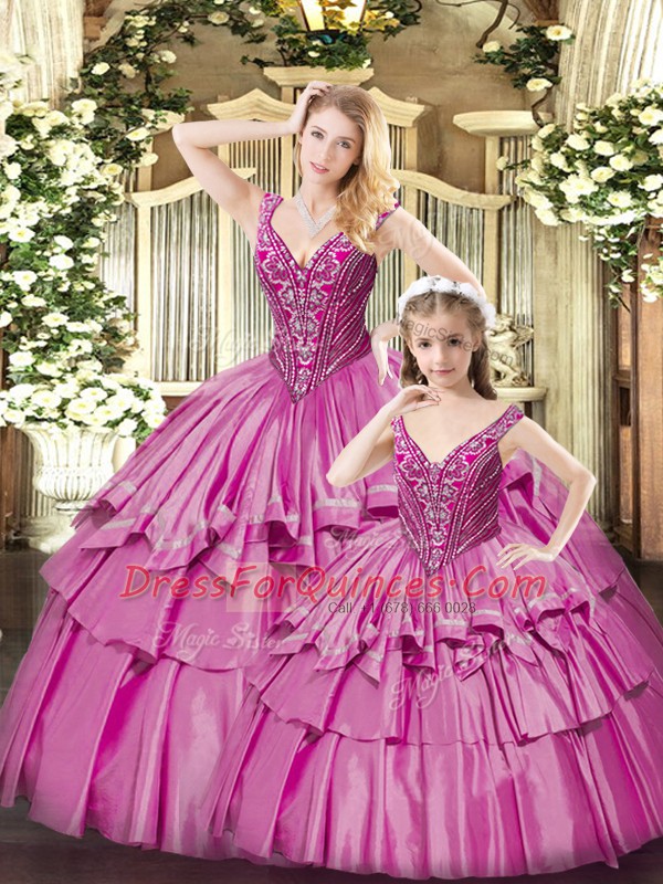 Elegant Fuchsia V-neck Neckline Beading and Ruffled Layers Quinceanera Gown Sleeveless Lace Up