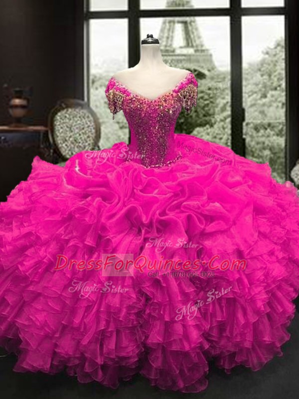 Fashion Sweetheart Cap Sleeves 15 Quinceanera Dress Floor Length Beading and Ruffles Fuchsia Organza