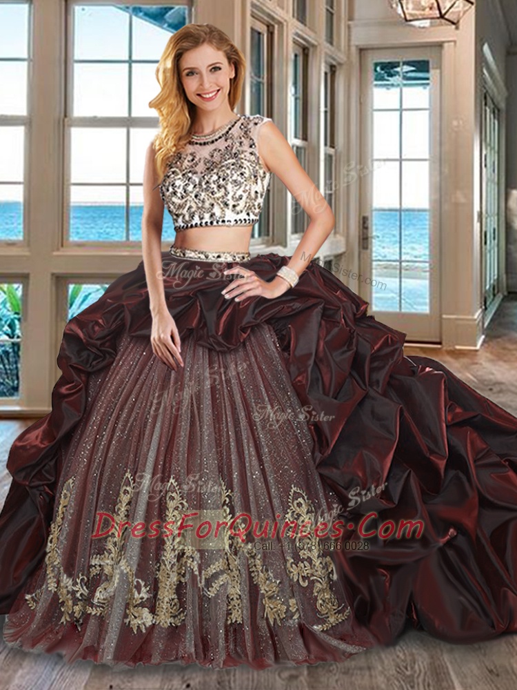 Fitting Scoop Cap Sleeves Organza and Tulle With Brush Train Backless Sweet 16 Dress in Burgundy with Beading and Embroidery and Pick Ups
