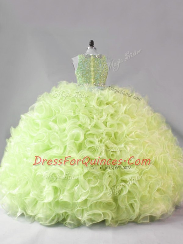 Flare Sleeveless Floor Length Beading and Ruffles Zipper Ball Gown Prom Dress with Yellow Green