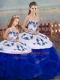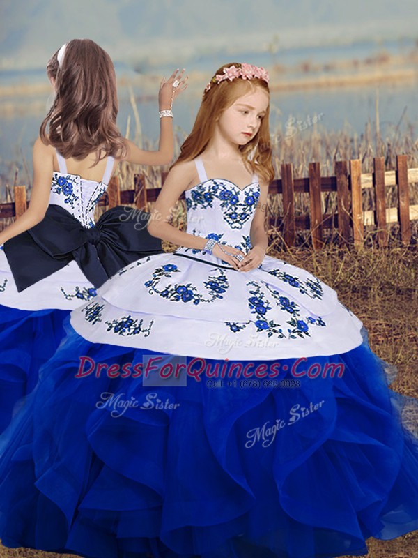 Floor Length Lace Up Quinceanera Dress Royal Blue for Military Ball and Sweet 16 and Quinceanera with Embroidery and Ruffles and Bowknot