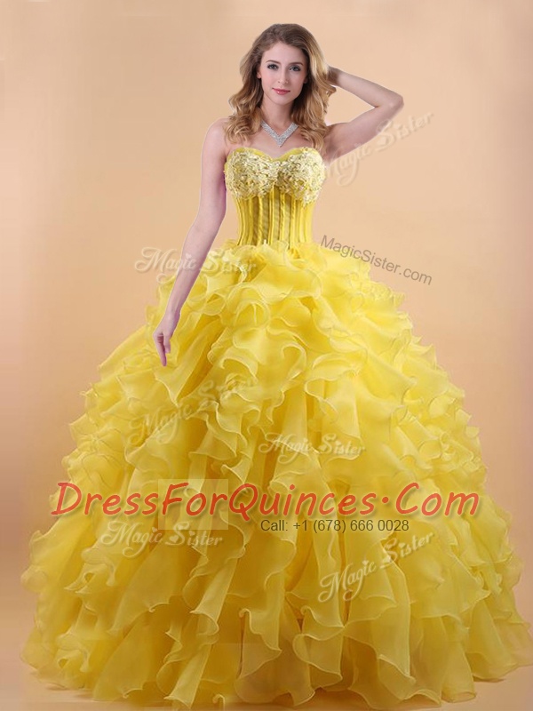 Gold Sweetheart Lace Up Appliques and Ruffles Quinceanera Dress Sleeveless