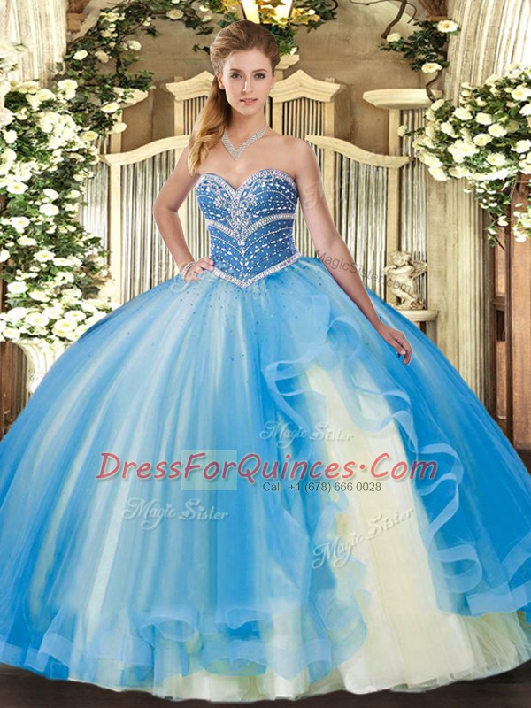 Graceful Baby Blue Lace Up Sweetheart Beading and Ruffles 15th Birthday Dress Tulle Sleeveless