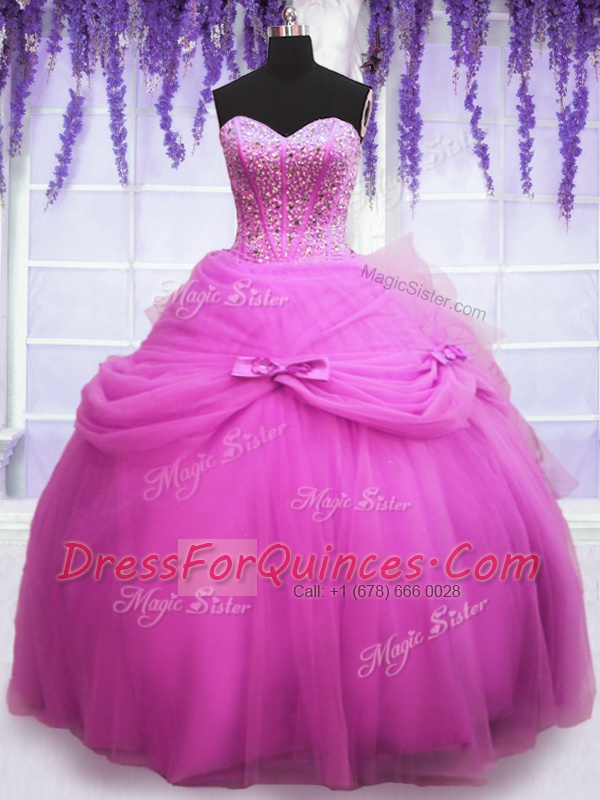 Graceful Sleeveless Floor Length Beading and Sequins and Bowknot Lace Up Ball Gown Prom Dress with Lilac