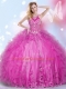 Halter Top Sleeveless Sweet 16 Quinceanera Dress Floor Length Beading and Appliques and Ruffles Hot Pink Tulle