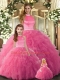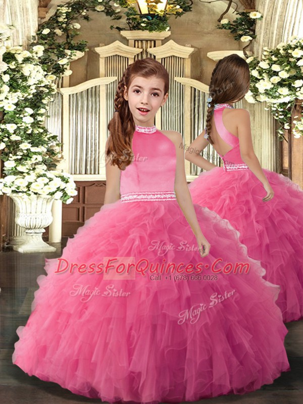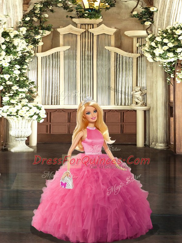 Hot Pink Ball Gowns Beading and Ruffles 15 Quinceanera Dress Backless Tulle Sleeveless Floor Length