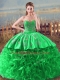 Hot Sale Green Quinceanera Gown Fabric With Rolling Flowers Sleeveless Embroidery and Ruffles