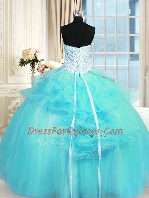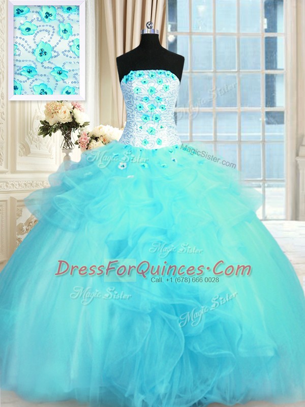 Luxury Floor Length Lace Up Quinceanera Dresses Aqua Blue for Military Ball and Sweet 16 and Quinceanera with Pick Ups and Hand Made Flower