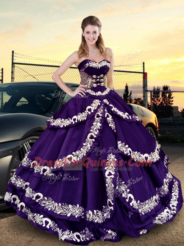Most Popular Sleeveless Satin and Taffeta Lace Up Quinceanera Gowns in Purple with Embroidery and Ruffled Layers