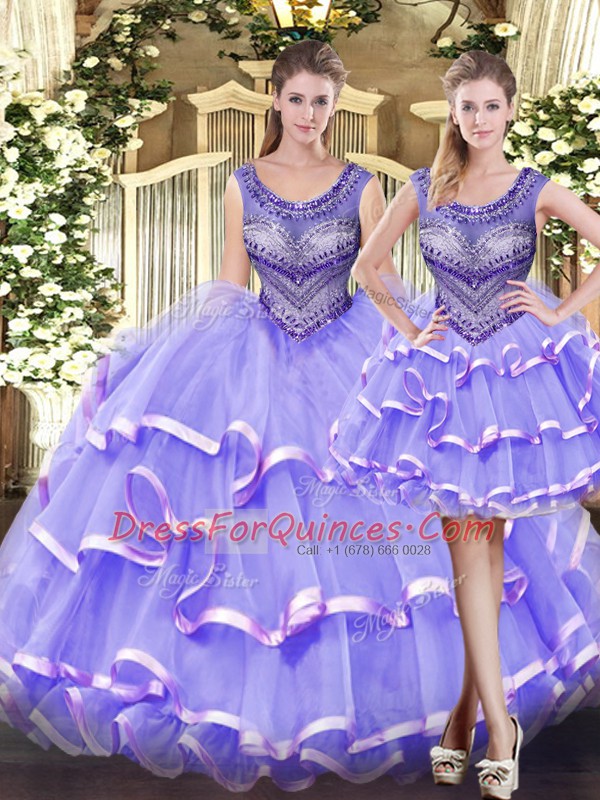 Noble Sleeveless Tulle Floor Length Lace Up Vestidos de Quinceanera in Lavender with Beading and Ruffled Layers