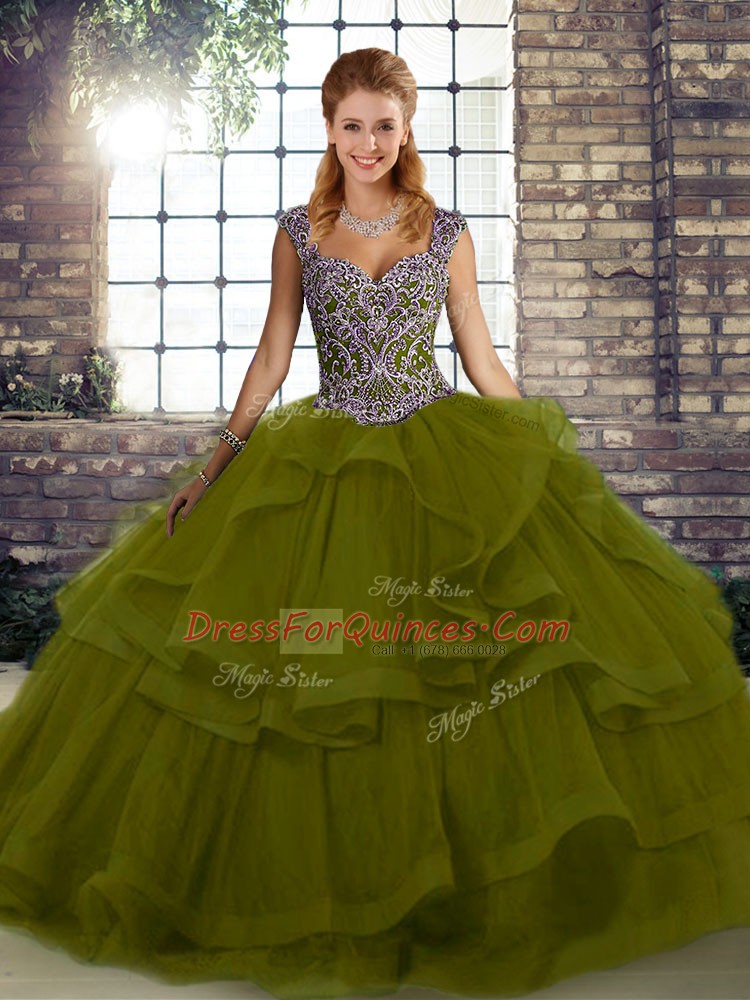 Olive Green Straps Lace Up Beading and Ruffles Ball Gown Prom Dress Sleeveless
