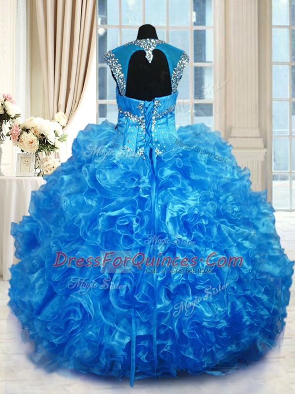 Organza Cap Sleeves Floor Length Sweet 16 Dresses and Beading and Ruffles