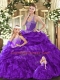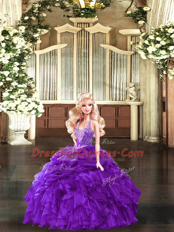 Purple Straps Neckline Beading and Ruffles Ball Gown Prom Dress Sleeveless Lace Up