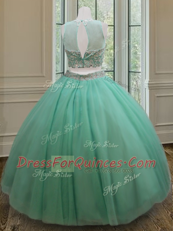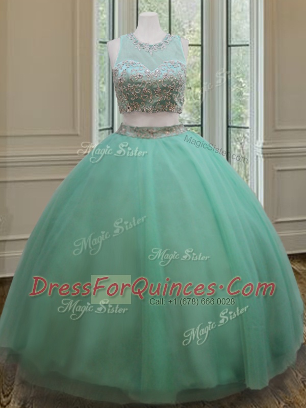 Scoop Apple Green Two Pieces Beading Sweet 16 Dresses Zipper Tulle Sleeveless Floor Length