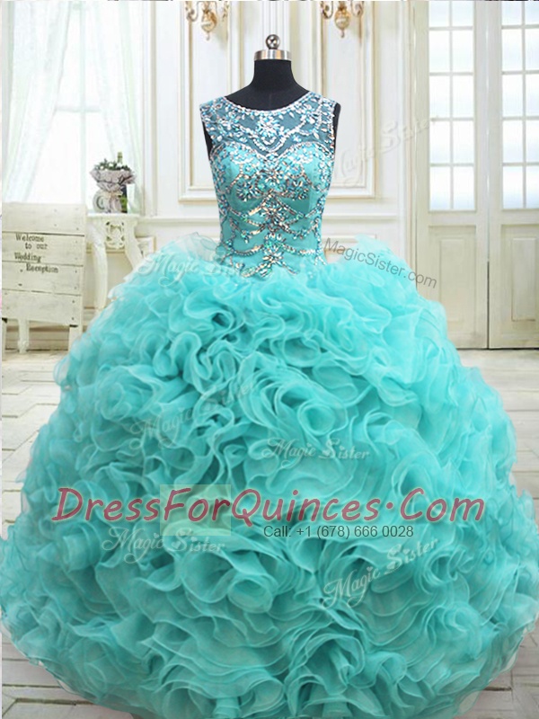 Scoop See Through Fabric with Rolling Flowers Sleeveless Lace Up Floor Length Beading Sweet 16 Quinceanera Dress