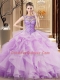 Scoop Sleeveless Beading and Ruffles Lace Up Quince Ball Gowns with Lilac Brush Train