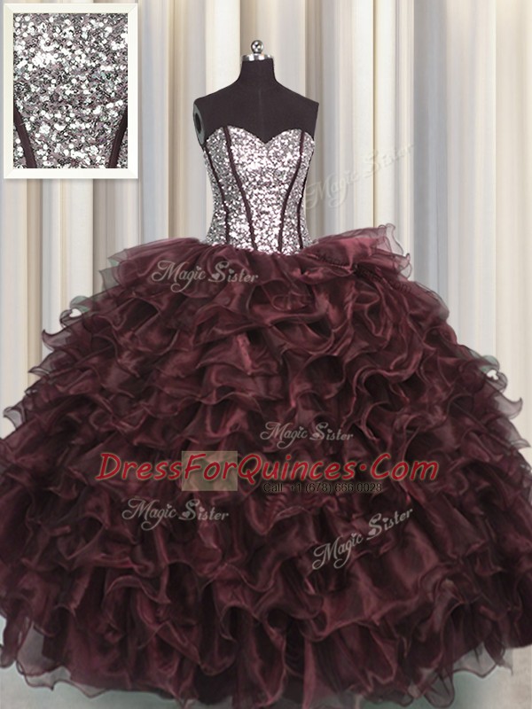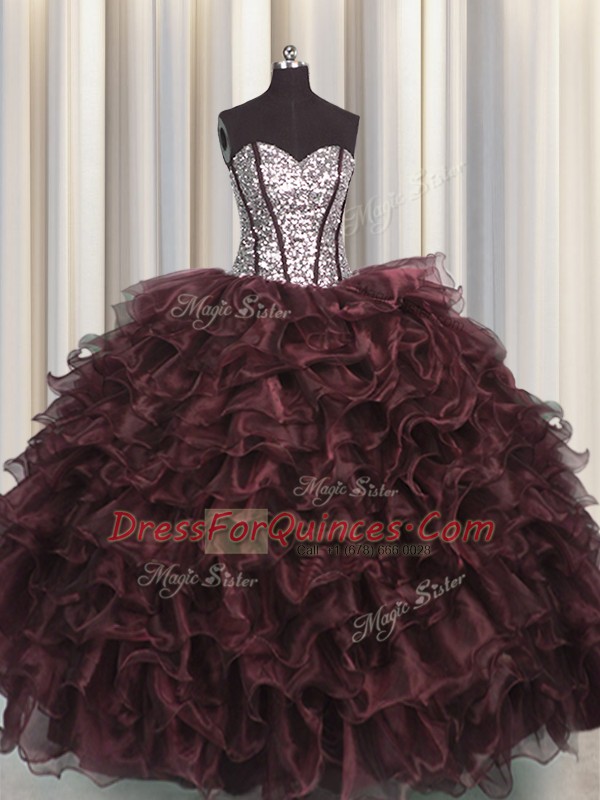 Sequins Visible Boning Floor Length Brown Sweet 16 Dress Sweetheart Sleeveless Lace Up