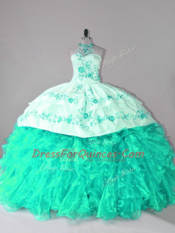 Sophisticated Lace Up Ball Gown Prom Dress Turquoise for Sweet 16 and Quinceanera with Embroidery and Ruffles Court Train