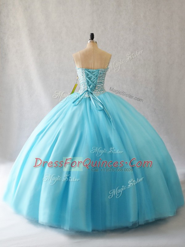 Sophisticated Sleeveless Tulle Floor Length Lace Up 15th Birthday Dress in Aqua Blue with Beading