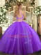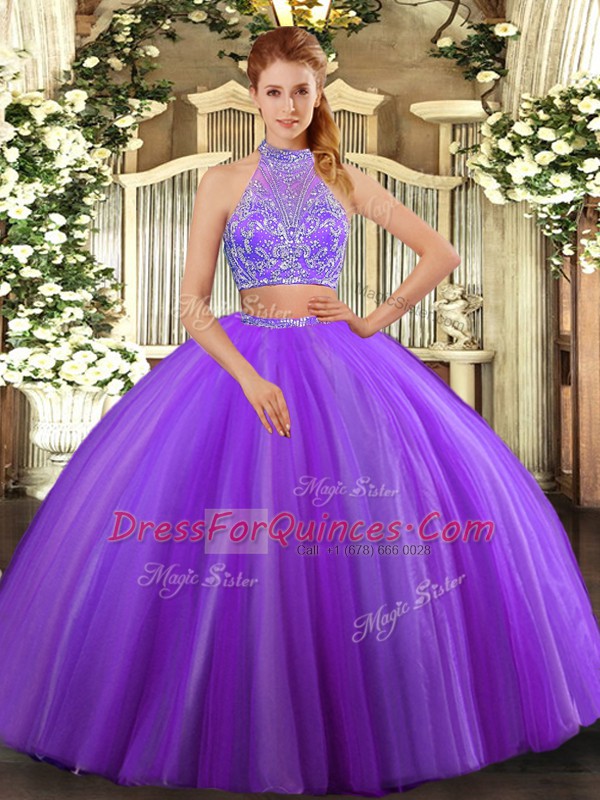 Sophisticated Two Pieces Quince Ball Gowns Lavender Halter Top Tulle Sleeveless Floor Length Criss Cross