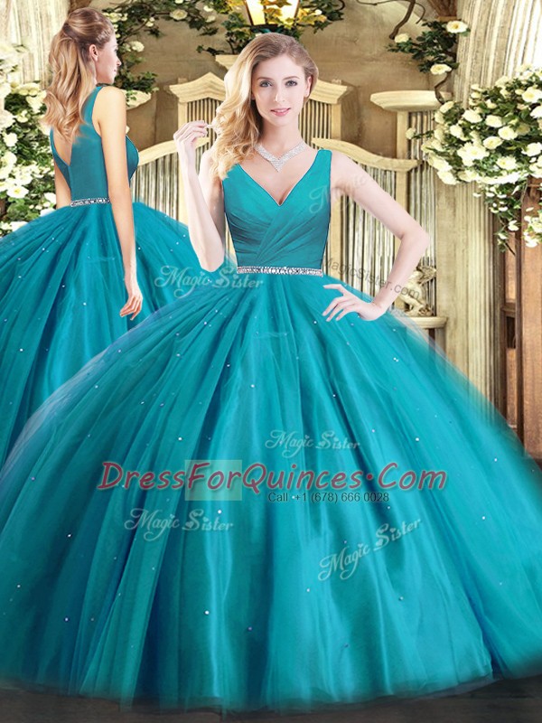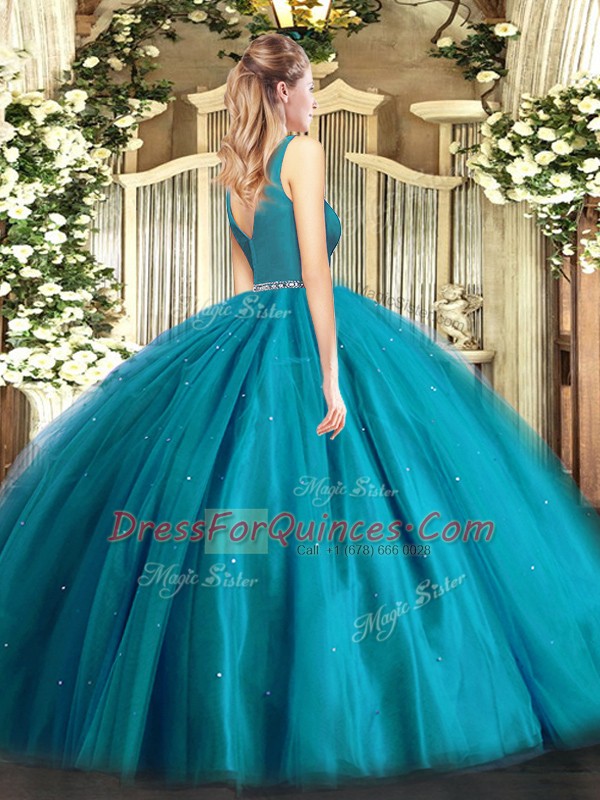 Teal Zipper Quince Ball Gowns Beading Sleeveless Floor Length