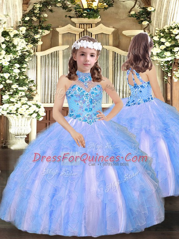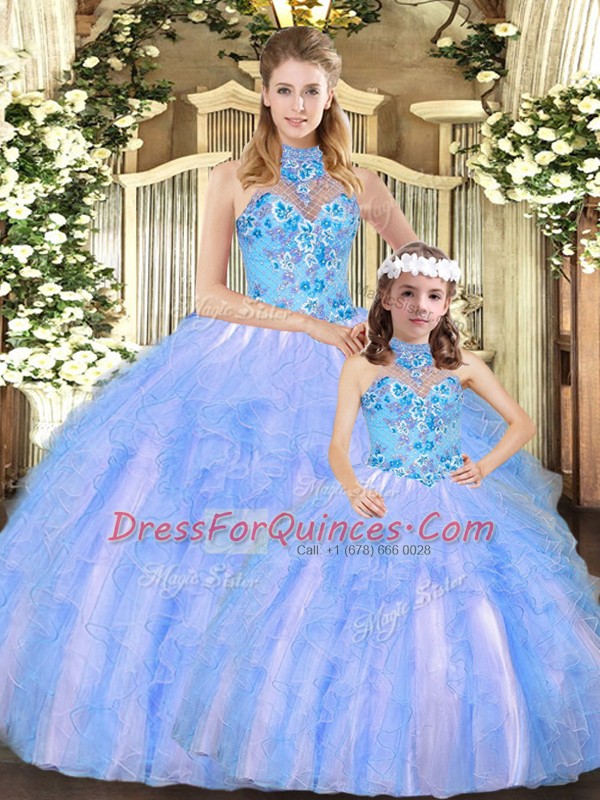 Tulle Halter Top Sleeveless Lace Up Embroidery and Ruffles Quinceanera Dress in Multi-color