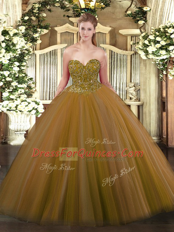 Tulle Sweetheart Sleeveless Lace Up Beading Quinceanera Dresses in Brown