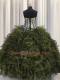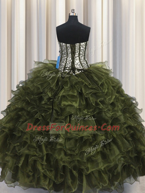 Visible Boning Olive Green Ball Gowns Sweetheart Sleeveless Organza and Sequined Floor Length Lace Up Ruffles and Sequins Quinceanera Gown