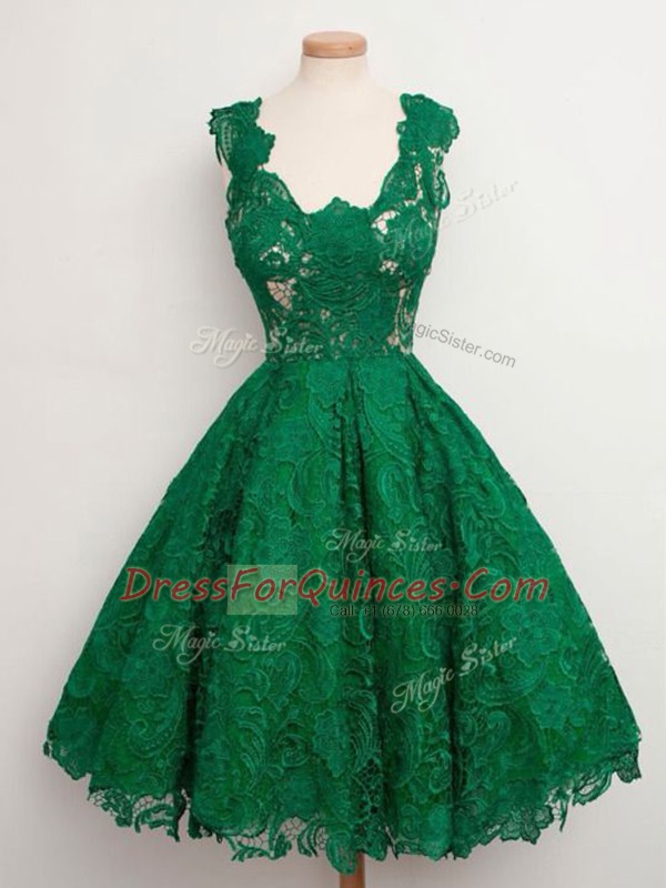 Custom Design Straps Sleeveless Court Dresses for Sweet 16 Knee Length Lace Green Lace