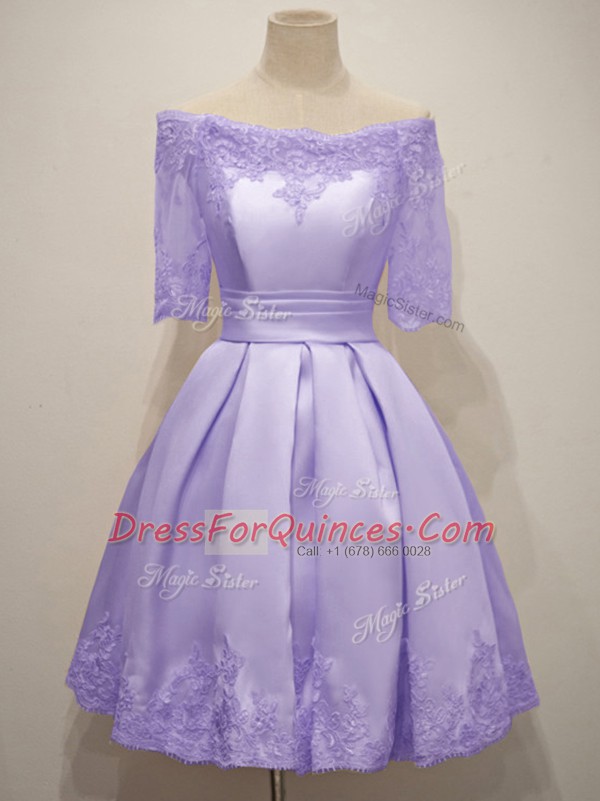 Lavender Half Sleeves Knee Length Lace Lace Up Dama Dress for Quinceanera