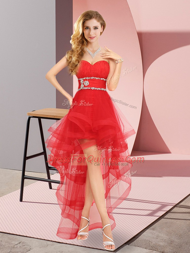 Luxurious Beading Quinceanera Court Dresses Red Lace Up Sleeveless High Low