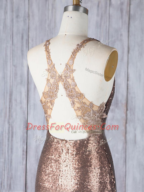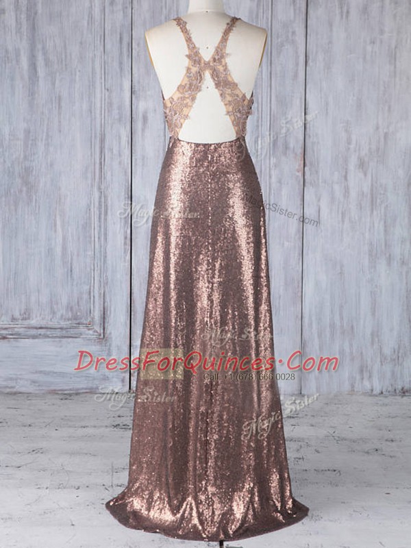 New Arrival Sleeveless Sequined Floor Length Criss Cross Quinceanera Dama Dress in Brown with Appliques