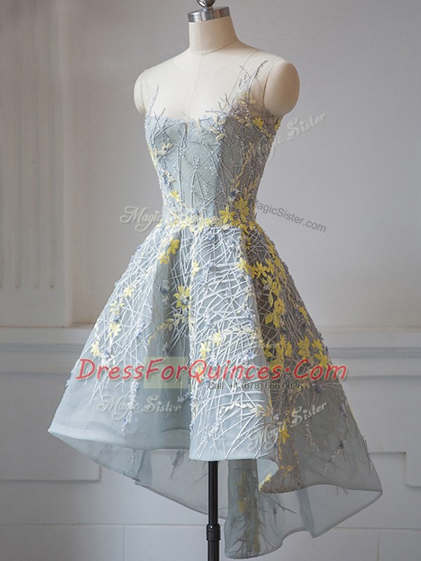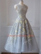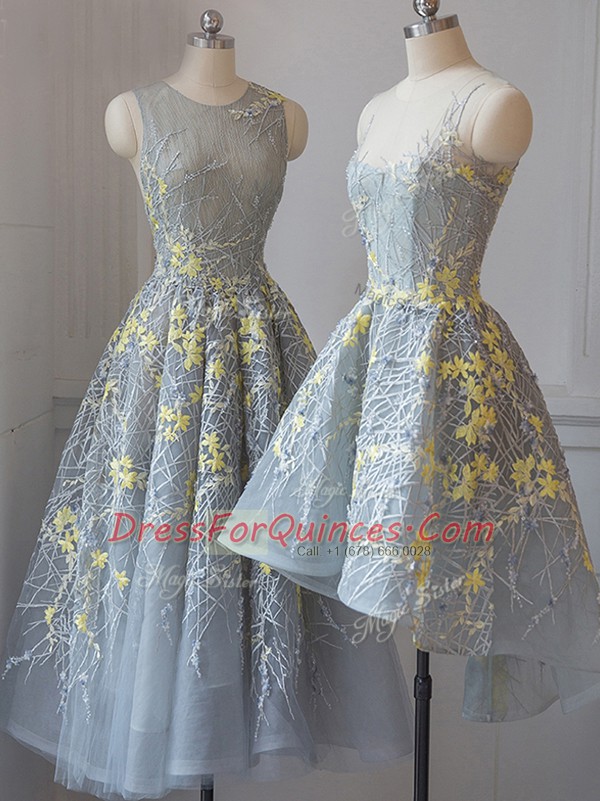 Sophisticated Grey A-line Scoop Sleeveless Tulle Tea Length Criss Cross Lace Vestidos de Damas