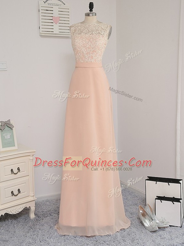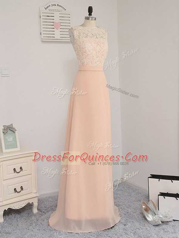 Suitable Peach Empire Bateau Sleeveless Chiffon Floor Length Backless Lace Quinceanera Dama Dress