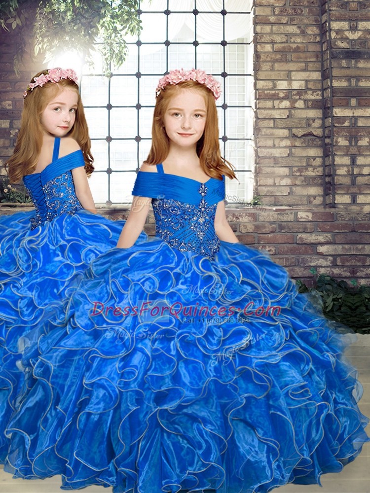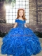 Blue Straps Neckline Beading and Ruffles Little Girls Pageant Dress Sleeveless Lace Up