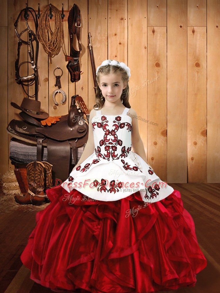 Cute Wine Red Lace Up Straps Embroidery and Ruffles Little Girls Pageant Dress Wholesale Organza Sleeveless